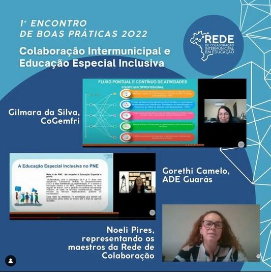 Tivemos como iniciativas promotoras o ADE Guarás (MA), que compartilhou um panorama geraal sobre a Política Nacional de Educação Especial e o ADE CoGemfri (SC), que compartilhou a construção feita, através da colaboração intermunicipal, de um projeto territorial de Educação Especial Inclusiva.